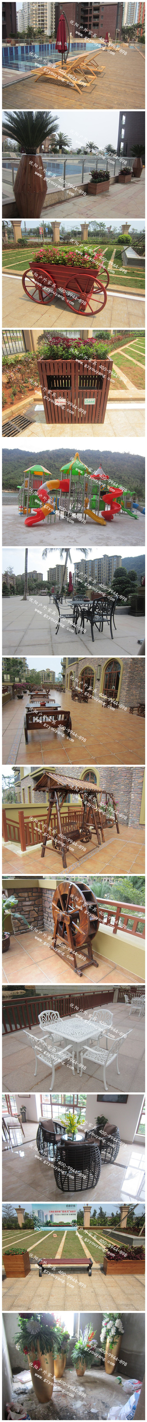 此次主要采购产品:实木沙滩椅、铸铝沙滩椅、花箱、花车、户外垃圾桶、铸铝桌椅、遮阳伞、钢木休闲椅、儿童组合滑梯等等。